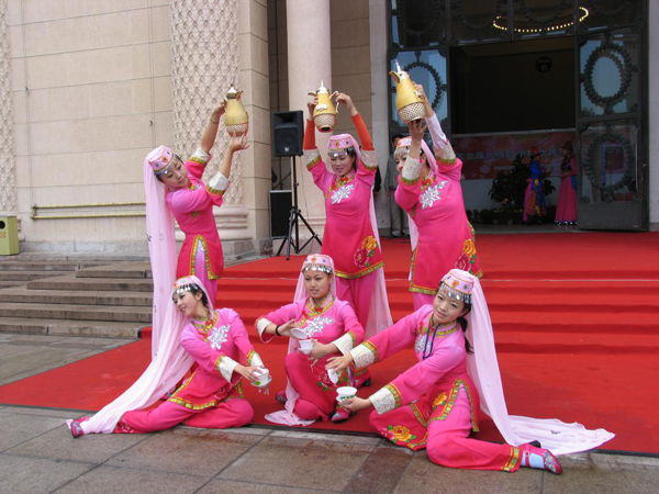 宴席曲:流行在中國西北地區(qū)回族、東鄉(xiāng)族、撒拉族、保安族的傳統(tǒng)習(xí)俗性舞蹈。是迎親時男方宴請女方送親者的宴席間演唱的歌舞形式。曲調(diào)優(yōu)美,節(jié)奏性強;歌詞多敘述民間故事、傳說和一些幽默逗趣的內(nèi)容。舞蹈動作不配合歌詞具體內(nèi)容,只表達歡樂的情緒。宴席曲多為2—8人的男子對舞,相互換位后,有屈膝半蹲、雙手伏膝的行禮姿態(tài)。其基本步法一般是腳尖或腳掌先落地、膝部屈伸,使身體如波浪起伏,與頭部的擺動、顫動相協(xié)調(diào)。手勢有單晃手、雙晃手、掏手、望月等,舞姿灑脫昂揚,表現(xiàn)了高原民族豪放、開朗和詼諧的性格。