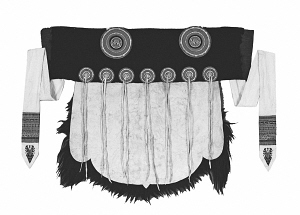 剪裁時,將羊皮修剪成U型,上部橫鑲一段黑氆氌(毛織品)或黑呢子,內襯天藍色棉布。其下用七對白色鹿皮條穗縫綴并列的七個小圓形彩線繡花布盤,肩部縫綴兩個大圓形彩線繡花布盤。羊皮上端縫釘兩條繡花白布長帶,帶端還繡有花鳥、魚蟲、動物、植物、幾何等圖案,據(jù)說是象征納西族人民如蜂似蝶地奔忙,以辛勤勞動換取甜蜜生活。