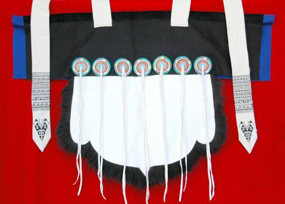 七星披肩所用材料為黑色綿羊皮,先將羊皮去毛、洗凈、硝白、縫成披肩,然后在披肩背上繡上自己縫制精美的七顆星星,每個星星中心垂下兩條布帶,整個布帶與白色寬帶相繞,帶梢端垂于后,披肩的兩角釘上兩條白布帶,勞動時拉到胸前交叉系緊?!边@樣一件精美的“披星戴月衣”是對勤勞的納西族婦女的歌頌,形如蛙身狀的披肩是古代納西族圖騰崇拜的標志,在納西族傳統(tǒng)中,青蛙是智慧之神,反映了納西族在美學、習俗等方面形成的傳統(tǒng)觀念和心理特征。