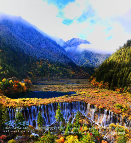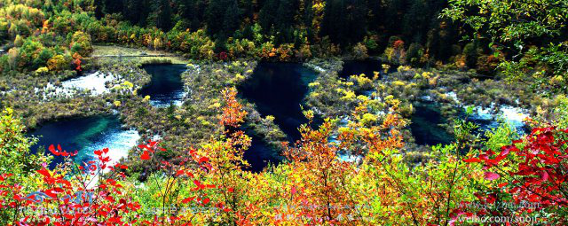 九寨溝四周群山聳峙,有雪峰數(shù)十座,高插云霄,終年白雪皚皚。河谷地帶奇水薈萃,其間有成梯形分布的大小湖泊114個(gè),瀑布群17個(gè),鈣華灘流5處,泉水47眼,湍流11段,以1870米的海撥高差,在12 座雪峰之間穿林跨谷,珠連玉接,呈Y字型串珠,逶迤近60公里,形成了中國(guó)唯一、世界罕見的以高山湖泊群和瀑布群以及鈣華灘流為主體的風(fēng)景名勝區(qū)。湖泊小者數(shù)平方米,最大的長(zhǎng)海長(zhǎng)達(dá)7公里。湖水終年碧藍(lán)澄澈,色彩斑讕,在陽(yáng)光照射下,呈現(xiàn)出藍(lán)、黃、橙、綠等多種色彩,絢麗奪目。天氣晴朗時(shí),藍(lán)天、白云、雪山、森林倒映湖中,水光浮翠,美麗如畫,并隨季節(jié)推移呈現(xiàn)出不同的色彩和風(fēng)韻,有“九寨歸來(lái)不看水”之說。