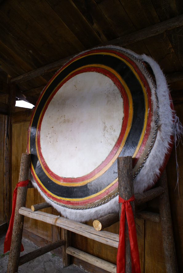 羌族羊皮鼓是打擊樂(lè)器,又名“羌鈴鼓”,羌語(yǔ)稱(chēng)“切歐兀”“切熱別日木”。有兩種形狀,一種是圓形鼓面的鈴鼓,直徑大約30—40厘米。鼓邊寬約15厘米,鼓柄置于正中,抓柄的長(zhǎng)度與鼓面的直徑相同,左手從背面握柄。另一種是扇子形狀的鈴鼓,鼓框和鼓柄為鐵制,抓柄端有一裝飾環(huán)圈,圈內(nèi)串以數(shù)個(gè)銅錢(qián)。兩種形制鼓面均蒙羊皮,各鼓音高低不一,鼓錘為竹制,敲擊的一端略微呈弓形。羊皮鼓的打法和鼓點(diǎn)的節(jié)奏變化豐富。目前,搜集到的有硬三鞭、軟三鞭、野雞撲、偷點(diǎn)子、牛擦癢等十多種。這些鼓點(diǎn)穿插在每個(gè)唱段與舞蹈銜接變化中,使表演者在統(tǒng)一的步伐、統(tǒng)一的動(dòng)作中,調(diào)節(jié)了節(jié)奏氣氛。由于表演具有即興式特點(diǎn),表演者的技術(shù)嫻熟程度和思想情緒變化將直接影響技巧的發(fā)揮。羊皮鼓突出鼓的表演,氣氛熱烈歡快,動(dòng)作粗獷質(zhì)樸,如“禳星辰”動(dòng)作,就是在鼓點(diǎn)、唱腔、動(dòng)作的有機(jī)結(jié)合中,表現(xiàn)出凜冽的氣勢(shì)。羊皮鼓在表演中,不僅給舞蹈提供了節(jié)奏,豐富了氣氛,而且鼓點(diǎn)的擊打更形成和衍化出許多獨(dú)特的舞蹈語(yǔ)匯。