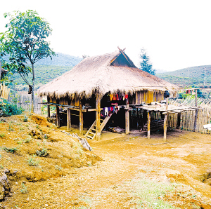 臨滄地區(qū)的耿馬縣芒洪鄉(xiāng)也是布朗族的聚居區(qū)。房屋以草頂居多,也有蓋竹瓦的。三開間居多,門在正中,左邊是火塘,是就餐待客和睡覺(jué)的地方,右邊放糧食雜物。房屋為木柱結(jié)構(gòu),縱向框架。大柱立于兩山墻中間,柱腳深埋地下,柱高依屋脊高度而定,柱頂以天然枝杈承托脊檁。以同樣的方法在四角各立頂端帶枝杈的柱子,柱高以屋檐的高度而定,承托邊檁。這樣6根木柱、3根檁木構(gòu)成了主要承重的縱向框架,也形成了雙斜面屋頂。在大柱間密栽小柱,小柱間再橫向綁扎竹片,從地面到柱頂形成密密麻麻的小方格子,這就是墻壁的骨架。然后把和了黃泥漿的長(zhǎng)草把一綹綹、均勻地掛到竹片上,將里外抹平,干后就成了“掛”著的草泥墻。