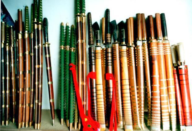 ★配刀把和刀鞘。刀把和刀鞘多用楠木加工而成,有的用銅、銀皮包裹,上面雕刻裝飾有各種花紋圖案,如“猛虎長嘯”“東山日出”“飛燕迎春”“十二屬相”等,佩刀上還系有紅纓背帶,匕首的把多用牛角雕刻裝飾而成。