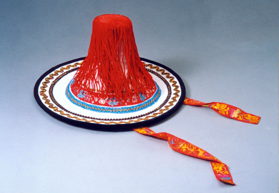 帽子是姑娘和已婚婦女的區(qū)別標(biāo)志。姑娘不戴帽子,前額戴“沙日達什戈”。這是一條寬約三寸長約一尺,下邊緣用紅色或白色珊瑚小珠穿縫許多珠穗的紅色布帶。已婚婦女身穿高領(lǐng)偏襟長袍,一般由綢、緞、布、褐、皮料縫制。衣領(lǐng)高齊耳根,袍子一般以綠、藍(lán)色為主,但也有深紅、紫紅等顏色。袍子下擺兩邊開衩,衣袖口至肘部用各色織錦緞、彩綢、彩緞花邊一圈圈縫綴裝飾。腰系腰帶(裕固族也叫“胡兒”,即系腰),主要是桃紅色或綠色,長袍上面罩一件高領(lǐng)偏襟坎肩,但也有無領(lǐng)偏襟坎肩。