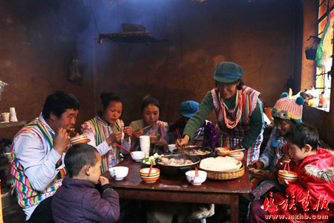 獨(dú)龍族文面女太恰一家在吃團(tuán)圓飯(余金成 攝影)