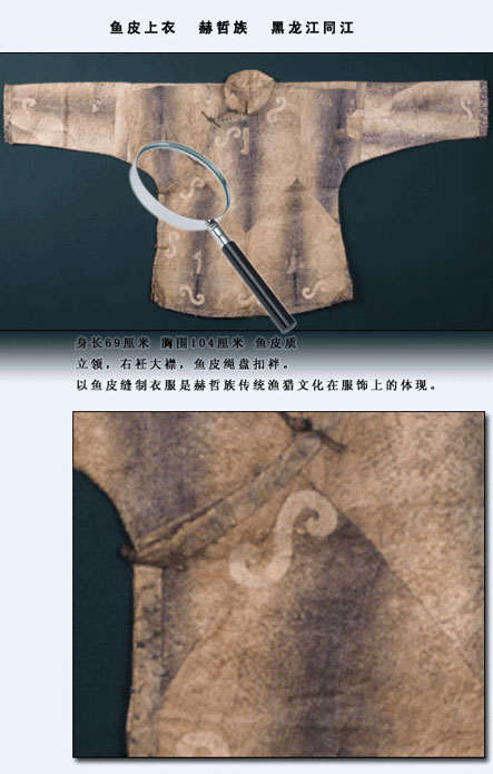 赫哲族的魚皮衣歷史久遠。我國古代文獻《山海經(jīng)》第九卷《海外東經(jīng)》中便有“玄股之國,在其(黑齒)北,其為人衣魚食鷗” 的記載?!耙卖~”西晉學者郭璞解釋為“以魚皮為衣也?!闭f明早在兩千多年前,赫哲族的先民就已使用魚皮做衣服了。另據(jù)密山新開流新石器時代遺址中出土的魚叉及骨針,證明赫哲族的先民捕魚和縫制魚皮衣有數(shù)千年歷史了。清代張晉彥的《寧古塔山水記》有:“魚皮部落,食魚為生,不種五谷,以魚皮為衣,暖如牛皮”的記載?!痘是迓氊晥D》記載:“赫哲衣服多用魚皮而緣以色布,邊綴銅鈴,亦與鎧甲相似?!绷硗?,地方志書對此也多有記載??梢姡照茏逯谱骱痛┲~皮衣是真實而久遠的。