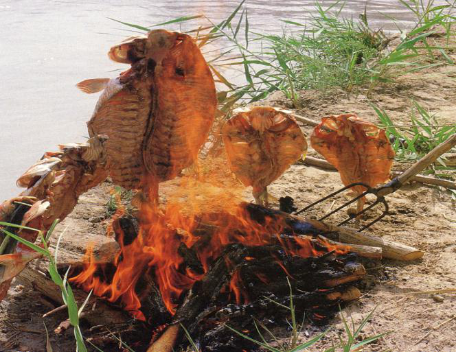 赫哲族人還把魚(yú)加工成各種熟食品食用,例如烤魚(yú)、炸魚(yú)、蒸魚(yú)、燉魚(yú)、“炒魚(yú)毛”等。其中,以“炒魚(yú)毛”最具特色。