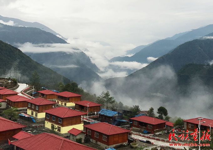 在高山之巔新建起來的達(dá)木珞巴民族鄉(xiāng)的安居房,是茫茫云海中最鮮艷的一抹紅(央金 攝影)