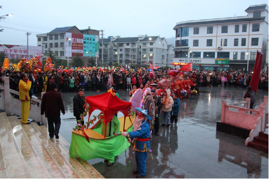 2019年2月16日農(nóng)歷正月十二是瓦寨鎮(zhèn)傳統(tǒng)大型集會活動日,舞龍為主要活動之一。午飯后,來自全縣各地的舞龍舞獅隊、花燈隊陸續(xù)到瓦寨政府廣場集結(jié),并在廣場右側(cè)有序排隊等待,各隊隊員精神抖擻、神采飛揚、迫不及待。前來參觀元宵舞龍的群眾和游客也不斷涌向廣場,大街小巷行人猶如潮涌,吆喝聲、歡笑聲、鑼鼓聲連綿不斷……下午五時許,活動在瓦寨鎮(zhèn)政府廣場正式開始,先是由鎮(zhèn)領(lǐng)導(dǎo)對脫貧攻堅各項惠民政策及5年來瓦寨取得的攻堅戰(zhàn)績進行宣講,宣講慳鏘有力、扣人心弦,特別是5年來瓦寨取得的攻堅戰(zhàn)績,一致得到人民群眾好評和認可。隨后,舞龍、舞獅、花燈表演紛紛上演,只見黃龍時而上下翻騰,時而昂首擺尾,雄獅時而就地打滾,時而賣萌撒嬌,樣子憨態(tài)可掬,花燈表演幽默滑稽,在前行中跑出各種套路,起伏波動、生動活潑,吸引了所有人的目光,贏得了陣陣喝彩……