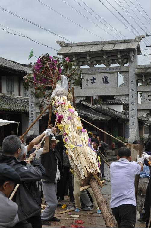 在劍川,都是由家里喜添子嗣的人家來(lái)籌備火把節(jié)的一切事宜,除了對(duì)新生兒的祝福,火把樹的裝扮也表示劍川人祈愿風(fēng)調(diào)雨順,人壽年豐、鄰里和諧?;鸢岩樱ㄩc年要扎十三層),上面六層的明子和柴分別由細(xì)到粗,一層接著一層,下面七層都是一樣的新柴。喻示每一個(gè)新的日子都紅紅火火。