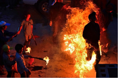 不到黃昏,鞭炮聲就響起來(lái)了。新生兒的父親點(diǎn)燃火把后,孩子們迫不及待地拿著小火把和松明粉,跑來(lái)跑去燒新生兒的的各種親戚,大人們樂(lè)呵呵地接受孩子們噴灑過(guò)來(lái)的火焰,并一致說(shuō)著很吉祥的祈愿祝福語(yǔ)?!皬拇嘶逇獠辉趪D!”、“一年更比一年好呀!”、“紅紅火火又一年”。男女老少在火把樹下吃喝玩樂(lè),其樂(lè)融融。糖、炒蠶豆、梨、蘋果等被大家傳來(lái)傳去,新生父親挨個(gè)向親友敬酒。親友鄰居喝著喜酒,一致祝福新生兒安康成長(zhǎng),將來(lái)富貴吉祥。