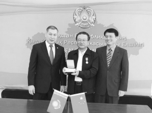 10月17日,艾克拜爾(中)被授予哈薩克斯坦外交部建立外交關(guān)系25周年金質(zhì)獎?wù)拢_克斯坦駐華大使沙赫拉特·努雷舍夫(左)為其頒發(fā)了獎?wù)隆?/span>
