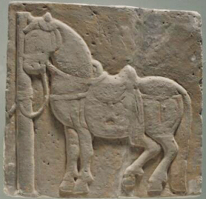 邊長30.5厘米,厚5厘米,呈正方形。配有鞍具和轡具,韁繩系在拴馬柱上。馬取立姿,似在歇息。馬首微頷,雙耳直立,頸部粗壯,身體肥碩,前腿挺直,后腿微曲,長尾及地。雕刻手法簡練,平實而質樸。