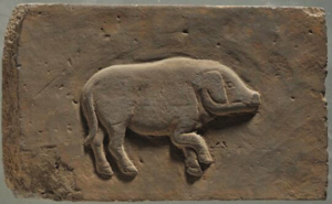 長30厘米,寬18.5厘米,厚5厘米,呈長方形。畫面中央為一只側身的小豬。小豬形象逼真,一只前踢抬起,體態(tài)肥碩,造型可愛,刻畫精細。
