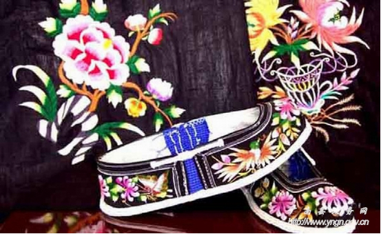 廣南刺繡歷史悠久,遍及壯鄉(xiāng)苗嶺,瑤山彝寨,街頭巷尾,處處都是刺繡的天地。壯族青年婦女的頭飾、圍腰心、圍腰頭、高綁布鞋要繡上圖案裝飾,兒童戴的貓頭帽、花風帽、燕尾帽、月牙帽繡有花邊絲綢,帽前鑲有十八羅漢銀器像,帽的左右兩邊掛有兩串銀器以示吉祥,壯族婦女的外衣繡有三角形、四方形花紋圖案,廣南壯族人民使用的生活用品,如被套、枕巾、桌布、窗簾、手帕以及婦女背小孩的背帶、兒童披風和靈芝鞋等都要繡上花鳥小草點綴,體現(xiàn)出美的情致。