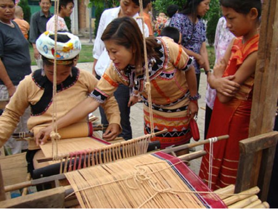 2010年上海世博會活動周期間,一臺名為《記憶云南》的18項非物質(zhì)文化遺產(chǎn)展示成為最吸引眼球的亮點之一?;顒蝇F(xiàn)場,18名云南非物質(zhì)文化遺產(chǎn)傳承人和民間藝人展示白族布扎、納西族東巴畫、傣族剪紙、傣族竹編、佤族織錦技藝等制作技藝。其間展示的佤族織錦技藝在民族文化風(fēng)情濃郁,文化底蘊深厚的耿馬縣佤族村寨里流傳甚廣。在耿馬的佤族村寨里,婦女們一般都會紡線織布,佤族傳統(tǒng)服飾也多用自染自織的土布縫制。此地佤族傳統(tǒng)服飾按地域分為兩大類。一類是分布在耿馬鎮(zhèn)、四排山鄉(xiāng)的傳統(tǒng)服飾,以女性身著佤族紅色短衣筒裙、男子身著佤族黑衣寬褲為標(biāo)志;一類是分布在勐簡鄉(xiāng)大寨村的“黃衣阿佤”服飾,以女性身著佤族黃衣筒裙、男子身著黃衣寬褲為標(biāo)志。佤族婦女所用的紡線有棉線、麻線兩種。棉主要是草棉,麻主要為苧麻和野生火麻,紡線采用內(nèi)地傳入的有紡錘的紡車。在耿馬鎮(zhèn)芒國村芒俄村民小組等佤族聚居村寨,筆者先后目睹了佤族織錦的全過程。只見紡織 中的佤族婦女一個個端坐在紡車前,凝神專注地操持著手中的活計。她們左手持麻,右手持紡錘,將紡錘放在大腿上一搓,紡錘轉(zhuǎn)動起來后,把麻纖維慢慢從左手拉出并捻成線,紡好一截線便將它繞到小竹棍上。如此這般不停地左右穿梭,又不斷地再搓、再捻,紡出的布匹紋理細(xì)密、結(jié)實挺拔。耿馬四排山鄉(xiāng)織錦的佤族婦女,大多采用一套竹木制的很原始的腰機,前后上下共有十七個零件。紡線時,她們將線的一頭栓在婦女腰上,另一頭用木棍穿好,擱在織布處釘在地上的兩根木樁上??棔r兩頭繃緊,將繞在木棍上的緯線穿到經(jīng)線的中間,然后用抒刀把線打緊。這種織法節(jié)奏雖然慢一些,但織出的布更加厚實緊繃,適用于紡織粗布和麻袋。在勐簡鄉(xiāng)大寨村的穿“黃衣”的佤族婦女,用黃土、玉米粉、茶葉、小飯豆、欖樹皮等7種植物做原料浸染的黃色棉線織錦,使用的有竹木制腰機和紡錘紡車兩種??楀\時,只見她們一邊捻線,一邊傳遞紡錘。不織時,又把紡錘和抒刀拆下,依然卷起放好。來自耿馬鎮(zhèn)、四排山鄉(xiāng)、勐簡鄉(xiāng)的佤族群眾介紹,中華人民共和國成立后,由于商店里賣的布料比佤族自織的布料更價廉物美,佤族人家自己紡織制作服飾的已經(jīng)不多,但是縫制麻布被和麻袋用的麻布,還是多數(shù)來源于自家紡織,尤其是佤族村寨婦女穿的裙子,也必須是自己織,不然會被人同族人恥笑為愚笨和懶惰。2009年以來,每年5月中旬,耿馬都要舉辦佤族“青苗節(jié)”慶典活動。活動期間,該縣不僅上演豐富多彩的文藝節(jié)目和民間體育比賽項目,還現(xiàn)場展示該縣獨具特色的佤族織錦技術(shù)。織錦展示中,來賓增長了對佤族傳統(tǒng)手工技藝方面的知識,不少圍觀群眾還饒有興趣地一邊詢問織錦者,一邊親自動手體驗這項古老而傳統(tǒng)的紡織技藝。