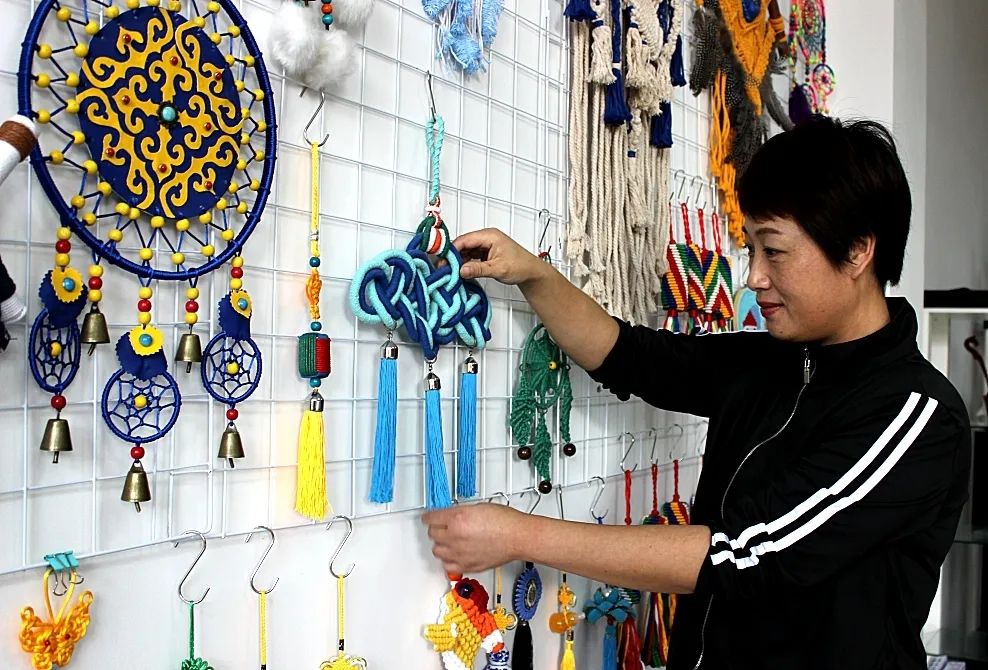 此外,繩結(jié)技藝傳承人把傳統(tǒng)工藝帶去了鄉(xiāng)村,讓傳統(tǒng)手工藝也成為了扶貧的一種助力。她們組織村里的婦女進行培訓(xùn)、學(xué)習(xí)。通過手工藝術(shù)村里的婦女們有了生存的技能,目前大多數(shù)村民及貧困戶在第一次培訓(xùn)的基礎(chǔ)上,已經(jīng)充分掌握了繩結(jié)技藝,能夠編織出一個合格的繩結(jié)產(chǎn)品,變成了名副其實的“巧娘”。她們扶貧村有協(xié)日塔拉嘎查、四方地村等。