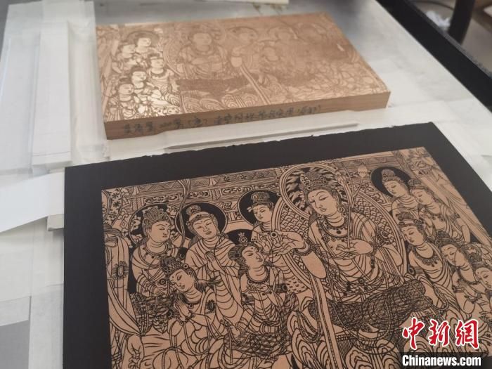 “將敦煌壁畫濃縮雕刻在木板上難度非常大,飛天裙裾要飄逸,菩薩的眉眼要有神,一刀都不能雕錯。”徐晉林最近剛完成以莫高窟444窟和57窟的壁畫為原型的雕版畫,目前累計(jì)完成上百件敦煌題材的雕版畫。