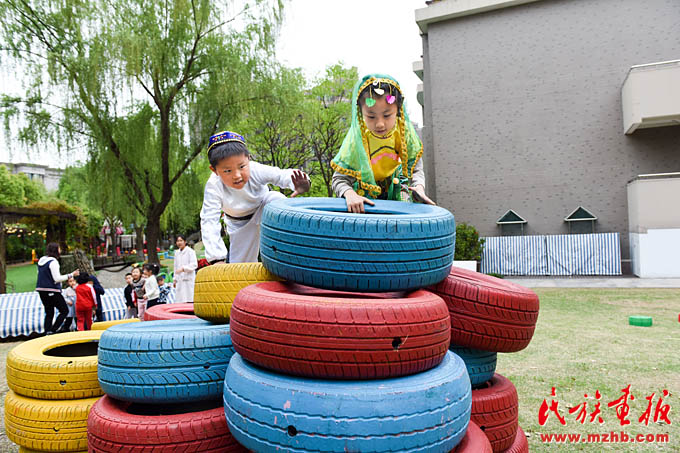 畬族的“摘柿子”、維吾爾族的“賽馬”、黎族的“跳竹竿”、蒙古族的“射箭”……天恒名都幼兒園的操場上,孩子們正積極參加各種民族游戲活動,沉浸在無憂無慮的快樂中。4月13日,是上海市莘莊工業(yè)園區(qū)天恒名都幼兒園的“民族接力棒小社團”活動日,孩子們非常期盼這每周一次的活動日。