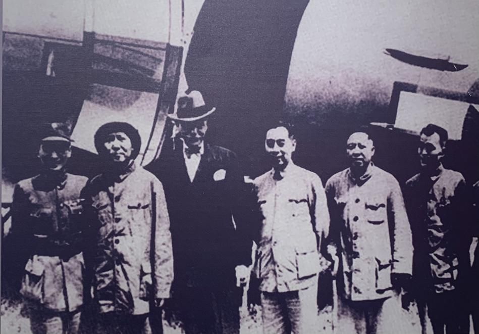 1945年,中共代表團(tuán)在赫爾利(美國(guó)駐中國(guó)大使)、張治中的陪同下臨行前在延安機(jī)場(chǎng)合影,左起為張治中、毛澤東、赫爾利、周恩來、王若飛、胡喬木。(許覬佳攝于貴陽(yáng)市達(dá)德學(xué)校舊址)