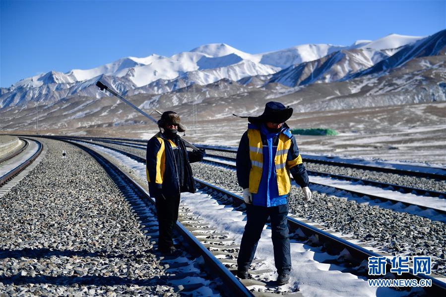 1月11日,中國(guó)鐵路青藏集團(tuán)有限公司格爾木工務(wù)段望昆線路車間的于本蕃(右一)和