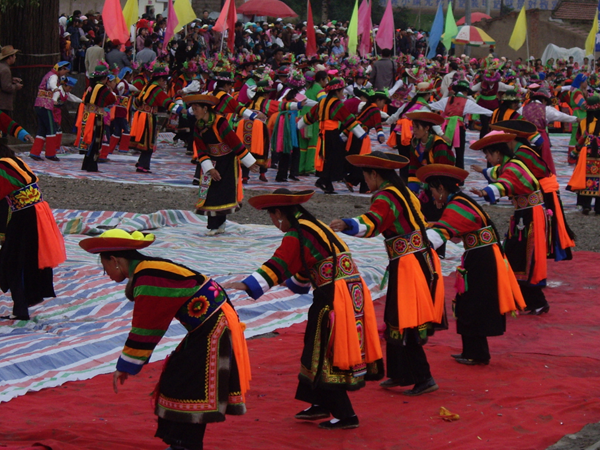 不同地區(qū)的土族舞蹈具有相對(duì)獨(dú)立性,互助的“安昭”、民和的“納頓”、大通的“踏灰”、同仁的“於菟”、甘肅卓尼的“嘎?tīng)枴钡仁亲罹叽淼拿耖g舞蹈?!鞍舱选?,土語(yǔ)稱之為“千佼日”,意為“彎曲”或“轉(zhuǎn)圈”,是土族民間喜慶節(jié)日和婚禮儀式中,用于禮贊祈祝的一種圓場(chǎng)群舞,也是一種歌舞結(jié)合、無(wú)樂(lè)器伴奏的集體舞蹈。一般由男女各半圍成圓圈,由一男子帶領(lǐng),一唱眾和。舞蹈動(dòng)作簡(jiǎn)單質(zhì)樸,舞者兩手由右胯旁起向左上方至右上方劃圓弧,變?yōu)樽笫智谀X前,右手高居于后,似雄鷹翱翔于藍(lán)天?!办遁恕蔽杓椿⑽琛!办遁恕?,是古代楚人對(duì)虎的方言稱謂。每年農(nóng)歷十一月二十日祭山神時(shí),名為於菟的舞者在赤裸的上身繪制虎豹圖案,模仿虎的形象“前端腿跳”舞蹈,達(dá)到祀神驅(qū)邪、祈求平安的目的。