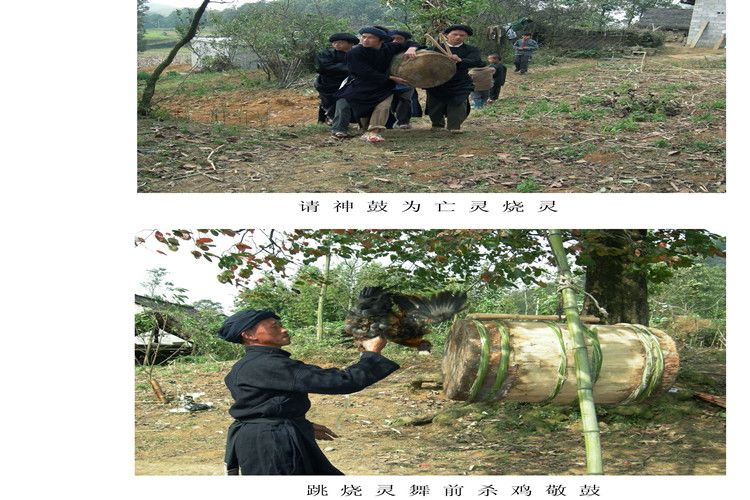 據(jù)苗族民間傳說,楊魯(指苗族祖先)死后,為祭奠他,苗族人民就用楊魯從玉皇大帝那里帶回來的木鼓和蘆笙為他做齋,鳴鼓三聲,吹奏蘆笙震天動地,接楊魯回來燒靈,因此鼓和蘆笙成為苗族人民辦喪事的信物,是神靈的象征,以鼓配唱,以鼓配笙吹跳,久而久之形成了苗族祭祀祖先和為亡靈燒靈開道的祭祀性舞蹈——“燒靈舞”。遠古時期,苗族是比較強大的民族,苗族的喪葬習俗,一直受著鬼神觀念的影響,并在意識形態(tài)深處,打下了深刻的烙印。由此可知,苗族“燒靈舞”源遠流長,以口傳心授方式代代相傳。