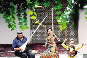 走進(jìn)艾依提·依明家,更像是走進(jìn)了一座民族樂器展覽館。記者看到,庭院中央鋪著紅色的地毯,4名自治區(qū)級(jí)非遺傳承人一字兒排開,正演奏著維吾爾族傳統(tǒng)音樂十二木卡姆的篇章,前來參觀的游客們也紛紛參與到歌舞表演之中。彈奏結(jié)束后,傳承人之一的買買提·鐵木爾熱情地向觀眾展示手中精致的都塔爾,自豪地分享著自己摸索出來的一套制琴和調(diào)音的秘訣。