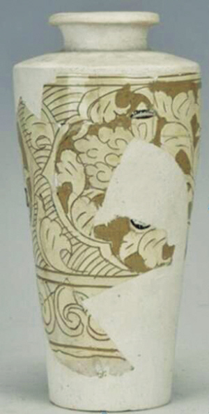 褐釉剔刻花葉紋經(jīng)瓶,高31厘米、口徑8.5厘米、底徑9厘米,二級文物。三組雙弦紋將腹部分為三部分,上部剔刻折枝花葉紋,葉片肥碩,左右舒展。其下刻劃一周卷葉紋,其下光素。內(nèi)外施褐色釉。殘存腹部一半,其余為后修復。