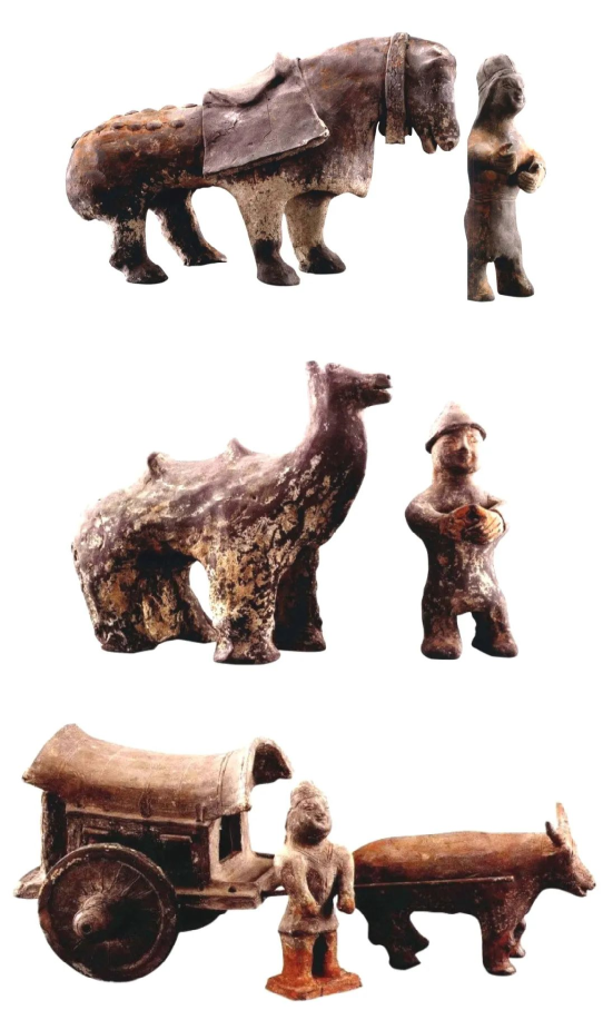 墓內(nèi)隨葬品有陶俑及陶生活器具、家禽及動(dòng)物、牛車等明器。陶俑共15件,有武士俑、男女侍俑、樂舞俑等。生活器具有灶、磨、燈、罐等。家禽及牲畜類動(dòng)物有豬、犬、雞、羊、馬、駱駝等。