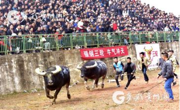 貴州省從江縣第十五屆原生態(tài)侗族大歌節(jié)的前一天,恰逢該縣逢亥斗牛日,丙妹鎮(zhèn)松學(xué)斗牛塘、谷坪鄉(xiāng)四寨河斗牛塘同時(shí)舉辦傳統(tǒng)牛王爭霸賽,喜迎一年一度“侗族大歌節(jié)”的到來,共有來自周邊村寨的80頭水牯牛參戰(zhàn),斗?;顒?dòng)場上名牛角逐,場面異彩紛呈,吸引數(shù)萬名觀眾前來觀戰(zhàn)。