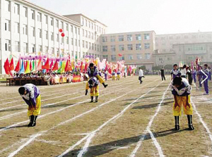 陣擺長龍跑馬城?!胺直矊⑦x良才,陣擺長龍對面排。正欲齊心奪勝券,格格送信出城來。”這首詩描寫的是滿族兒童春季玩的一種游戲——“跑馬城”。玩這種游戲時,孩子們分成人數(shù)相同的兩隊橫列,面向而站。玩時,甲隊先誦兒歌一句,乙隊接下句,一遞一句:“機機靈,跑馬場,馬城開,打發(fā)格格送信來!”“你要誰?我要某某某!”被點到名字的兒童立刻向對方沖去,對方陣營則手臂相連形成一道防線,沖撞者如果沖破對方的防線,就從對方陣營中挑選一人帶回自己的隊伍;如果沒有沖破對方的防線,沖撞者就被對方俘虜了。然后雙方再進行下一輪“對話”和“沖營”。游戲結束時,以剩下人數(shù)多的一方為勝方。這種游戲最適合男孩玩,他們往往玩得滿頭大汗,樂此不疲!
