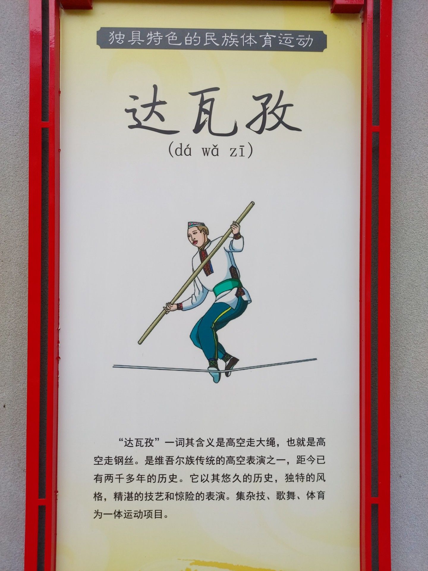 “達(dá)瓦孜”一詞其含義是高空走大繩,也就是高空走鋼絲。是維吾爾族傳統(tǒng)的高空表演之一,距今已有兩千多年的歷史。它以其悠久的歷史,獨(dú)特的風(fēng)格,精湛的技藝和驚險的表演。集雜技、歌舞、體育為一體運(yùn)動項(xiàng)目。