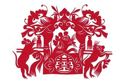 冬日的陽光透過玻璃窗,灑在老屋的炕上。幾位婦女在炕上鋪一塊布,對窗盤腿而坐,然后一手捏紅紙,一手拿剪刀,神情專注地剪“老鼠嫁女”。這是春節(jié)前在和林格爾縣河頭村看到的畫面。老鼠嫁女,也叫老鼠娶親,在傳統(tǒng)剪紙中有不同的版本。據(jù)了解,民俗剪紙“老鼠娶親”在清道光年間就開始流行了。欣賞和林格爾剪紙傳承人創(chuàng)作的“老鼠娶親” ,老鼠的形象多采用粗獷輪廓,又用細(xì)線條加以襯托,如老鼠胡子、花轎穗子、喜鵲羽毛、花紋等。河頭村的婦女剪窗花時,鼠是常表現(xiàn)的題材之一,被稱為“靈人”,如老鼠舔燈盞、老鼠偷瓜、老鼠吃葡萄、鼠咬天開等。幾十年前,段蓮女老人剪的老鼠靈活生動,富有動感,遠(yuǎn)近聞名,她的 “吉祥鼠”剪紙技藝傳承至今。