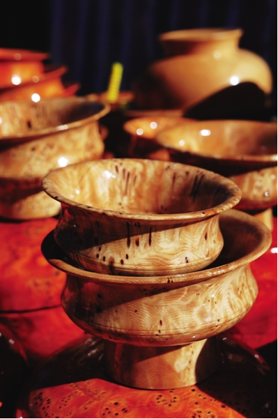 官員們使用的木碗,固然也非常注重外面的金銀寶石包裹,而木碗本身,也有一套非常固定的學(xué)問,盛開水不裂,摔到地上不會(huì)破,不燙手不冰手,體輕而質(zhì)固,經(jīng)久耐用,可以爺孫相傳。用這種碗盛食,可以完全保持食物原味,吃酥油糌粑等油肉類食品猶為適宜。比之于一般瓷碗,是碗中上品。這種木碗一般都是選用一些稀有雜木的節(jié)或者根雕琢而成,除了材料本身,在加工過程中的工序也十分重要,必須要加工出來一些獨(dú)特的花紋,比如磷火紋,或豬鬃紋,或貓頭鷹眼紋等,有這種花紋的碗,就要格外名貴,比如這次普布次仁兄弟所制作的大型核桃木碗,全身均勻地布滿了貓頭鷹眼紋,所以才能賣出這么高的價(jià)格。在西藏很多地區(qū),都流傳著這樣一個(gè)諺語(yǔ):“一只上等木碗等于10頭牦牛?!?/p>
