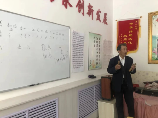 南文述從小酷愛音樂,深感傳統(tǒng)音樂的魅力,為了讓千年古韻律更好地綻放光彩,潤澤當?shù)厝罕姷木袷澜?,南文述退休后長年收集、整理古樂曲相關(guān)資料,學習、傳承古樂曲演奏,在全縣范圍內(nèi)共收集到七十余首。商都縣大力挖掘和保護文化遺產(chǎn)工作開展后,為南文述免費提供了工作室,南文述在此開辦了民族樂器培訓班,為感興趣的群眾義務(wù)教學。目前已有學員60余人,2022年古樂曲申報成功為第七批內(nèi)蒙古自治區(qū)級非物質(zhì)文化遺產(chǎn)代表性項目,在當?shù)厝罕娚顚拥木褡非笾邪l(fā)揮著越來越重要的作用。