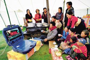 四川省甘孜州甘孜縣卡龍鄉(xiāng)卡龍村的牧民們高興地在新型帳篷中通過(guò)移動(dòng)電視收看節(jié)目。尹鋼攝