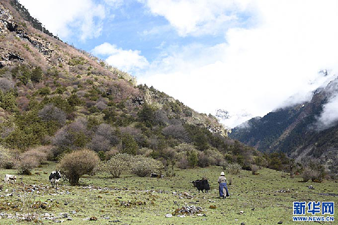 卓嘎在山上喂牛