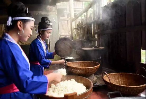 兩名姑娘在蒸糯米飯