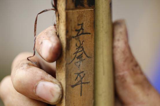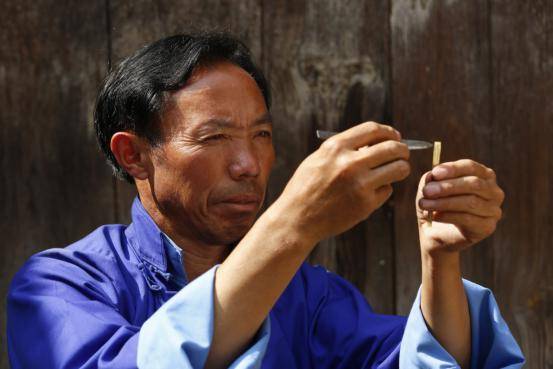 制作蘆笙大的工序有12道,再細(xì)一點有幾十項。如第一道是到山上去選竹子,拿尺子慢慢比劃,三拳的有多長,要很細(xì)心地選,確實可以用。取下來之后,第二道工序是拿到河邊去洗,用紗布搓。因為竹管有很多斑點,關(guān)節(jié)處有很多毛,要很細(xì)致的把那些東西全搓掉。弄好之后用太陽曬,曬干曬白。第三道工序,就是取杉樹的木頭做笙斗,計劃好做三拳的是多少公分,四拳是多少公分。十二道工序,后面越學(xué)越復(fù)雜,每一道工序都很講究。