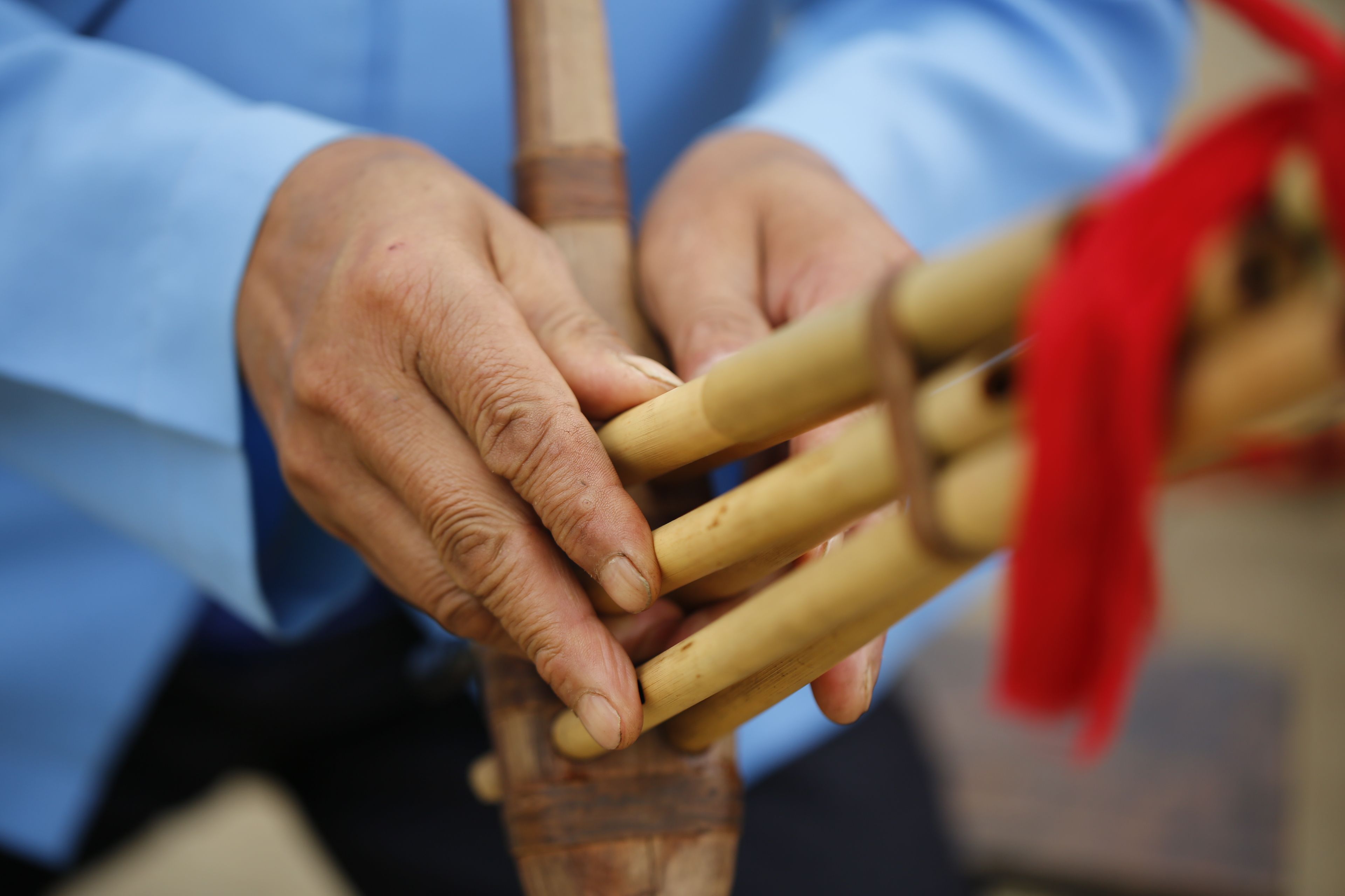 圖片名稱(chēng):貴州貴陽(yáng)苗族花鼓舞傳承人鄧開(kāi)倫教授他人吹奏蘆笙