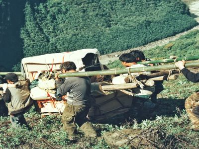 圖片名稱:村民們把仔細(xì)打包的鋼琴抬回村里